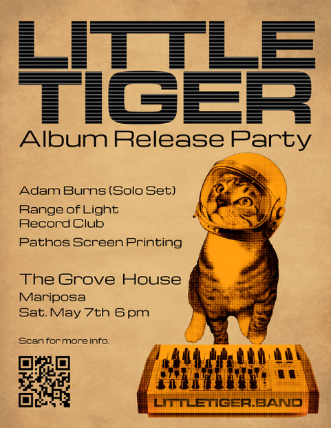 The last three years have been challenging, but transformational. We have had the time and space to dig deep into what inspires and moves us, and to write, play, and evolve Little Tiger into something new. Please come out and join us on Saturday, May 7th at 6 pm at the Grove House in Mariposa, where we’ll at long last share our new album with you. We’ll take you on a journey through a new wave/synth pop landscape that will ground you in things long forgotten, and open your heart to what is yet to come.